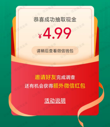 今天的活动比较简单,就是一份调查问卷,答完有个抽奖,一般就几元红包,不会太多,不是必中,是大概率有。